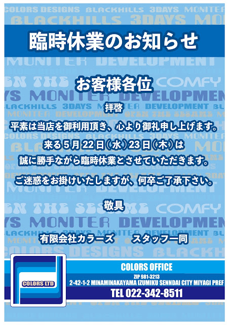 22日(水)、23日(木)は誠に勝手ながら臨時休業とさせて頂きます。