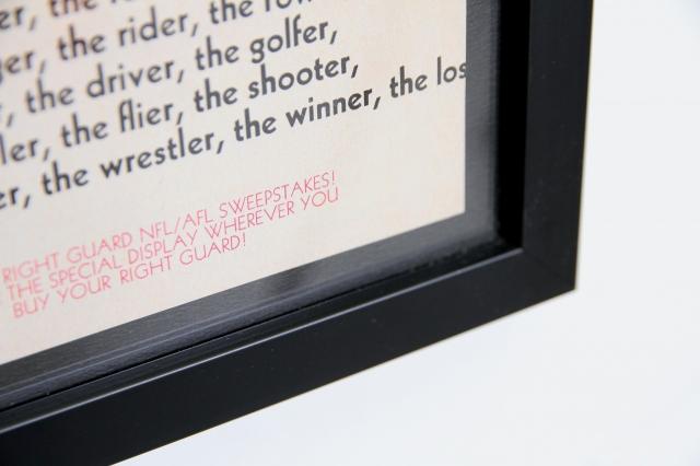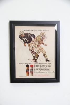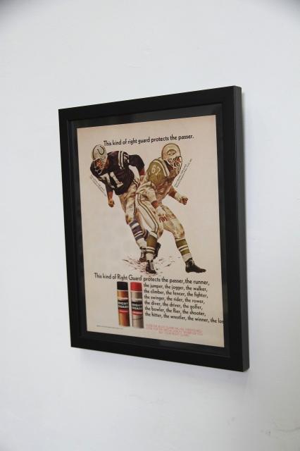 LIFE誌のヴィンテージ広告を額装したアートフレーム。「THE GILLETTE COMPANY」というアメリカの会社で発売されていた制汗剤スプレーの広告です。 躍動感あるアメフトの選手が描かれていてアメフトファンには必見。