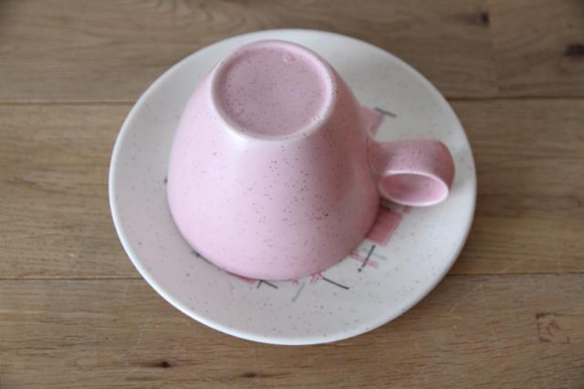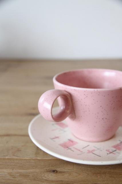 1950年代、アメリカのカリフォルニアに存在した名窯 Vernon Kilns(バーノン・キルンズ)。 ミッドセンチュリー期ならではの遊び心溢れるデザインで今なお愛される同ブランドより、希少な「Tickled Pink(ティックルド・ピンク)」シリーズのカップ&ソーサーになります。