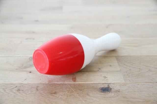 ボウリングのピンの形をしており、赤と白のプラスチック製で、海賊のキャラクター「Jolly Wally」が描かれています。