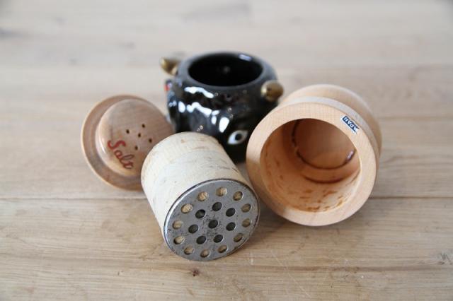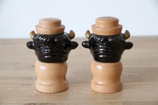 艶やかなブラックセラミックで表現された牛のヘッドと、温かみのある天然木を組み合わせた、非常に珍しいヴィンテージの調味料入れセットです。