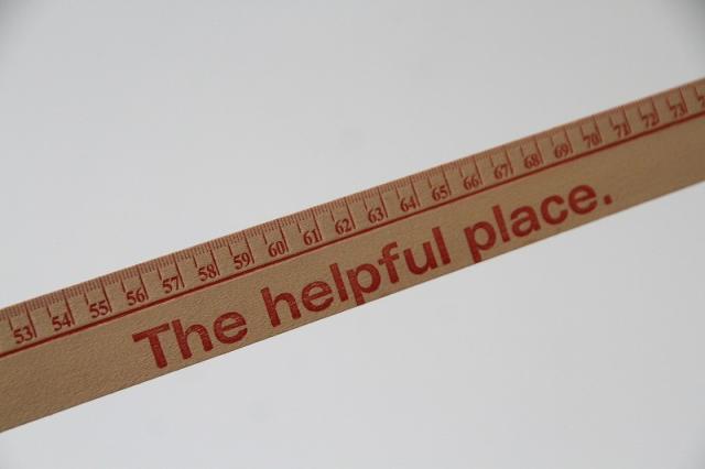 一般的なヤード棒(36インチ/約91.4cm)よりも長く、目盛りが36インチを超えて刻まれている大変珍しいロングタイプです。実用性はもちろん、使い込まれたような木の風合いと「The helpful place.」の赤いロゴデザインが非常にオシャレで、インテリアとしても映える一品です。