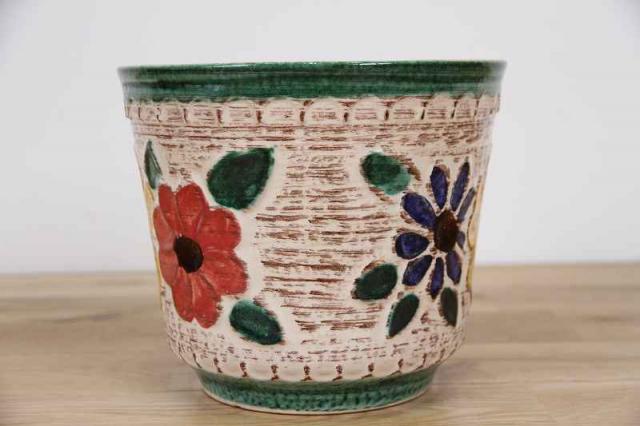 ドイツ製ヴィンテージの陶器製フラワーポットです。おそらく1950~70年代製のものと思われます。全体的に大きくデザインされたレトロなお花模様がお部屋を一気に明るくしてくれそうです。陶器製の鉢カバーの中では、大きめで珍しいサイズです。