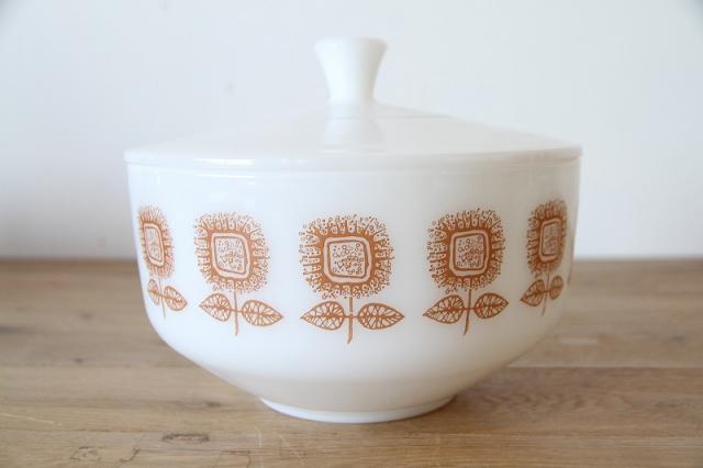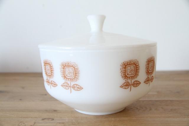 アメリカを代表するガラスメーカー、Federal Glass(フェデラルグラス)社製のミルクガラス・キャセロールです。 パッと目を引くオレンジの「ひまわり(サンフラワー)」のような抽象的なフラワーデザインが、キッチンや食卓にレトロで明るい彩りを添えてくれます。