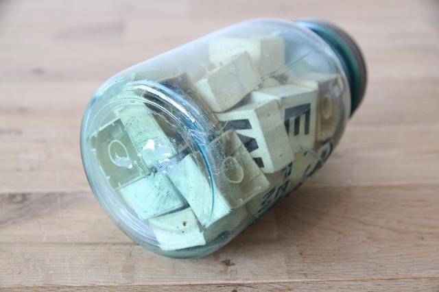 ヴィンテージ Ball社製メイソンジャーと、その中に詰められたレトロなアルファベットブロックのセットです。