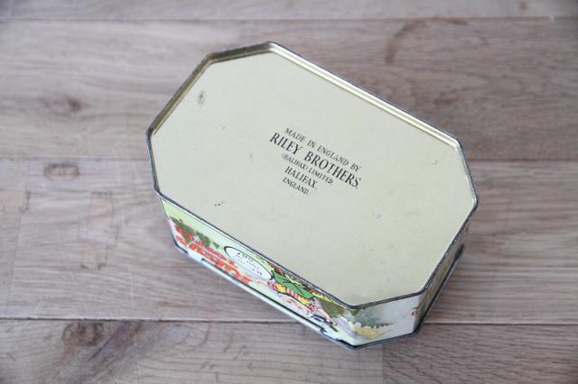 ブリキ缶の底面には「MADE IN ENGLAND BY RILEY BROTHERS (HALIFAX) LIMITED. HALIFAX. ENGLAND.」と印字されています(画像: IMG_0086.jpg)。