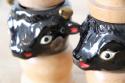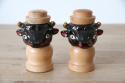 艶やかなブラックセラミックで表現された牛のヘッドと、温かみのある天然木を組み合わせた、非常に珍しいヴィンテージの調味料入れセットです。