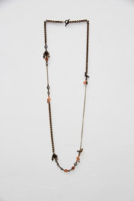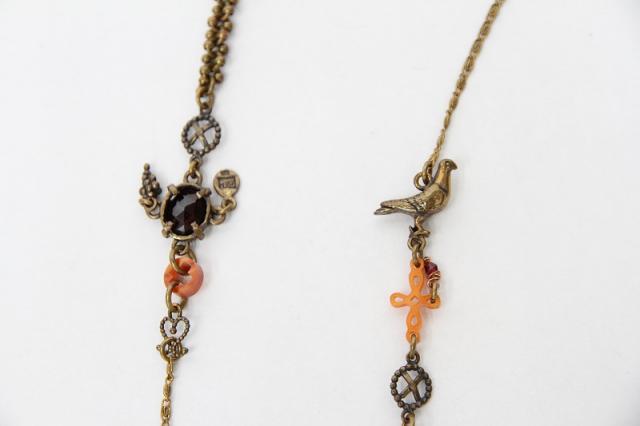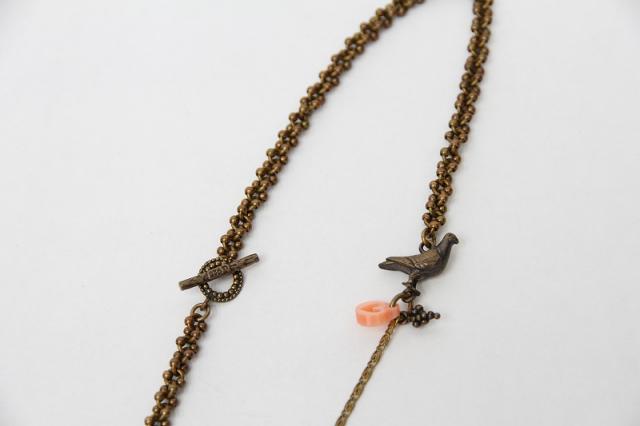唯一無二の特別感を味わえる、Gem Kingdomのネックレス。様々なタイプのチェーンや、鳩のモチーフ、天然石などが絶妙なバランスで並んだデザイン。胸下までのロングネックレスなので、シャツなどの上から合わせるのもおすすめ。