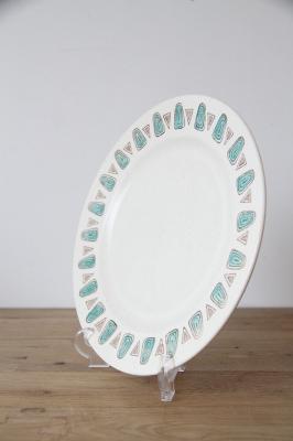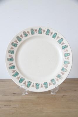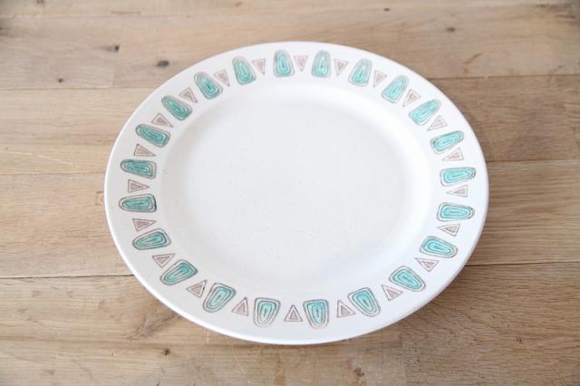 ターコイズブルー(またはアクアグリーン)の流線的なモチーフと、茶色の三角形が交互にリム(縁)を彩り、食卓にレトロで個性的なアクセントを加えます。