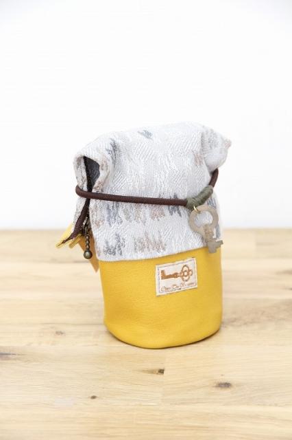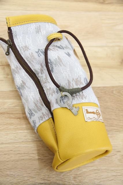 上部のヴィンテージの鍵チャーム付きのゴムの留め方次第で様々な形状のアイテムのケース、カバーにアレンジ可能です。