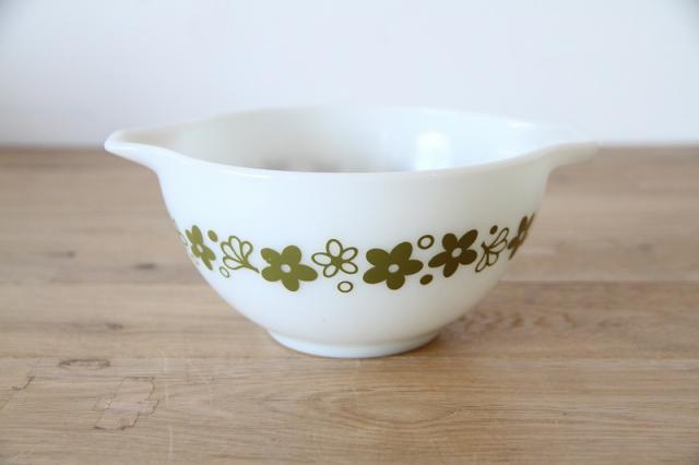 アメリカの家庭で長く愛されてきた、オールドパイレックス(Old Pyrex)のアイコン的なモデル、「スプリングブロッサム・グリーン(通称:クレイジーデイジー)」のシンデレラミキシングボウルです。