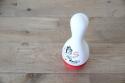 ボウリングのピンの形をしており、赤と白のプラスチック製で、海賊のキャラクター「Jolly Wally」が描かれています。