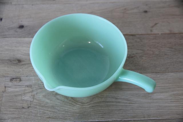 Fire-King(ファイヤーキング)を象徴するジェダイカラーの片手ポット(ソースパン)です。注ぎ口とハンドルが付いた使い勝手の良い形状で、ミルクパンやソース作り、またボウルとしてもマルチに活躍します。