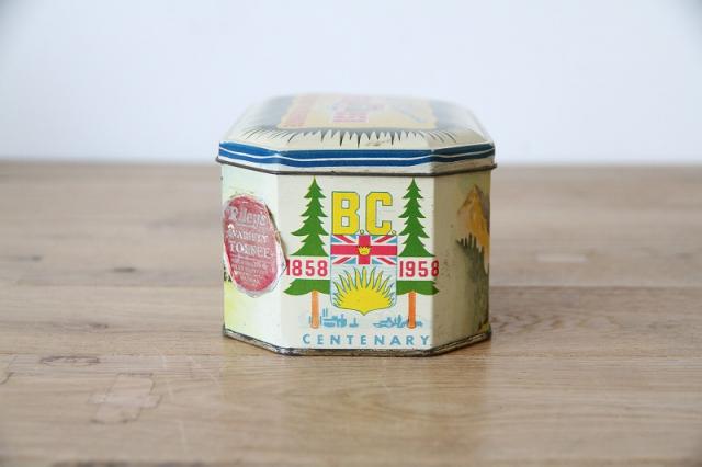 ブリキ缶には「1858 - 1958」「BC CENTENARY」「A CENTURY TO CELEBRATE」と明記されています(画像: IMG_0084.jpg, IMG_0085.jpg)。