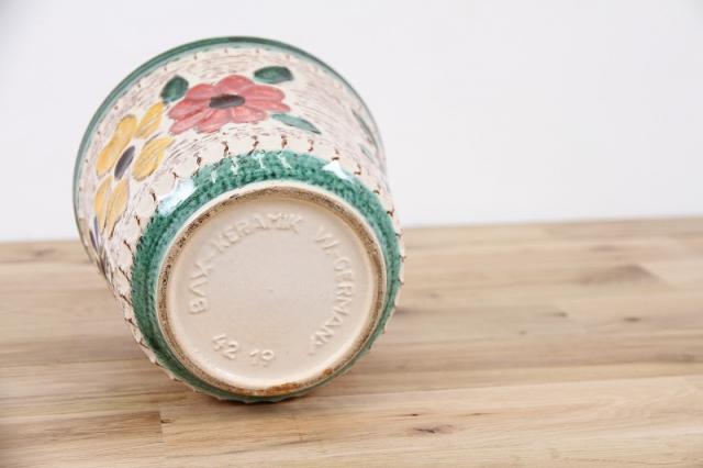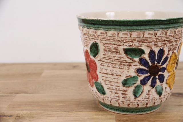 ドイツ製ヴィンテージの陶器製フラワーポットです。おそらく1950~70年代製のものと思われます。全体的に大きくデザインされたレトロなお花模様がお部屋を一気に明るくしてくれそうです。陶器製の鉢カバーの中では、大きめで珍しいサイズです。