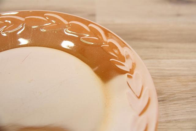 月桂樹の葉をモチーフにしたローレルシリーズのケーキプレート。ピカピカした「ピーチラスター」はアメリカらしいポップなカラーです。