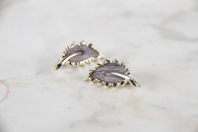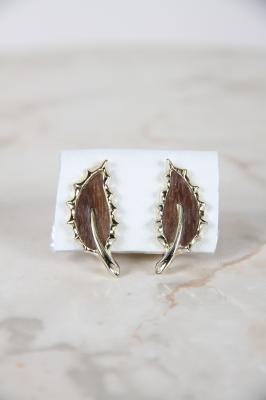 Sarah Coventry社製、葉っぱのモチーフのイヤリングです。葉のブラウンはウッドでできていて、よく見ると木目が見えます。耳の形に添って着けられ、イヤーカフのような雰囲気もあります。