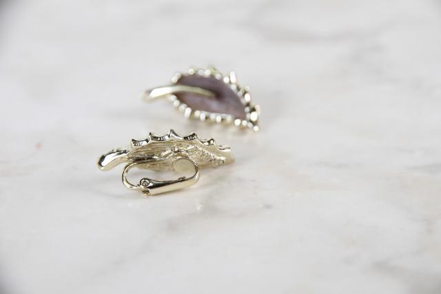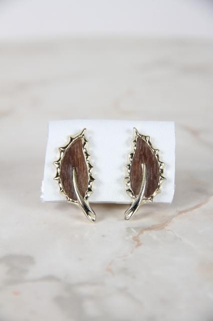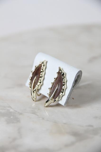 Sarah Coventry社製、葉っぱのモチーフのイヤリングです。葉のブラウンはウッドでできていて、よく見ると木目が見えます。耳の形に添って着けられ、イヤーカフのような雰囲気もあります。