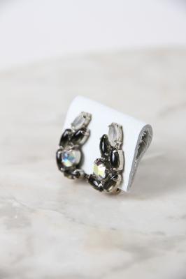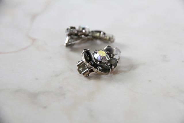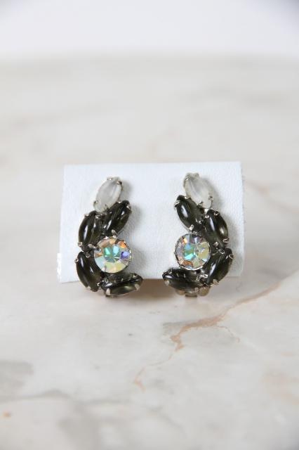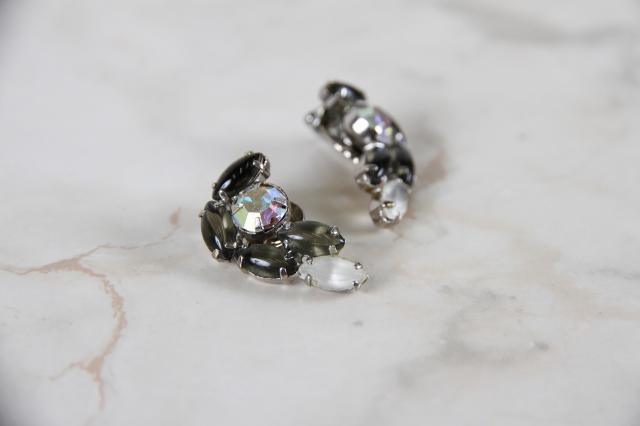 アメリカ製、オーロラのラインストーンにグレイッシュなカラーを組み合わせたシックなヴィンテージイヤリング。耳のふちに沿っていくようなフォルム。