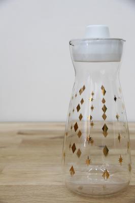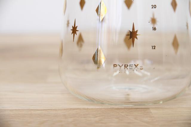 ゴールドの箔プリントがミッドセンチュリーの面影を残すパイレックスのヴィンテージジャグです。底近くのダイヤに少しプリント擦れがみられますが、そこまで気にりません。樹脂の蓋も変色などもなく綺麗な状態を保っています。