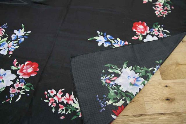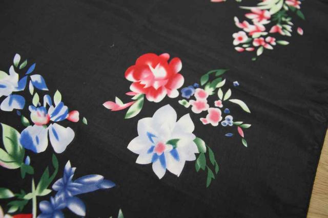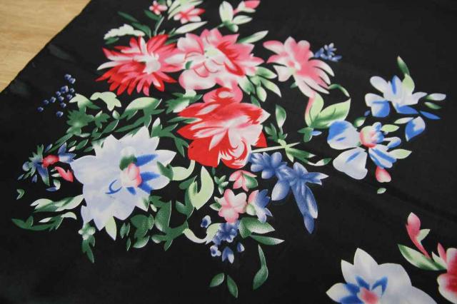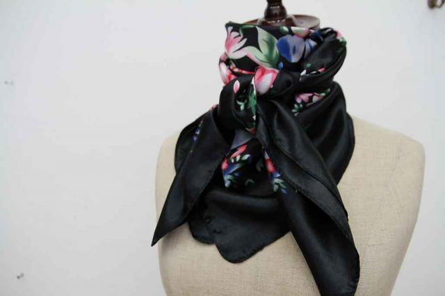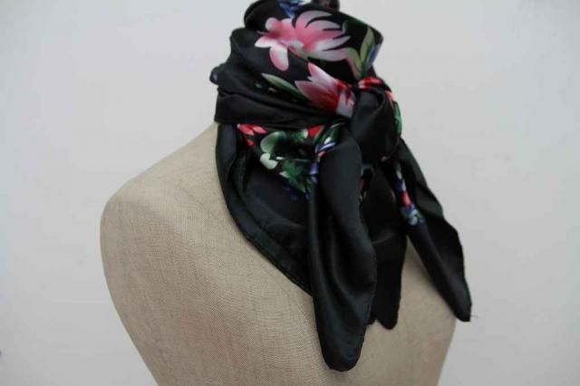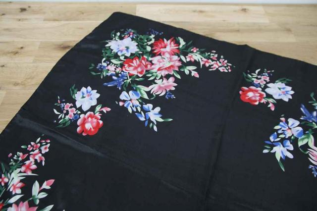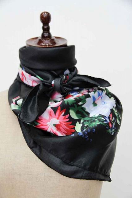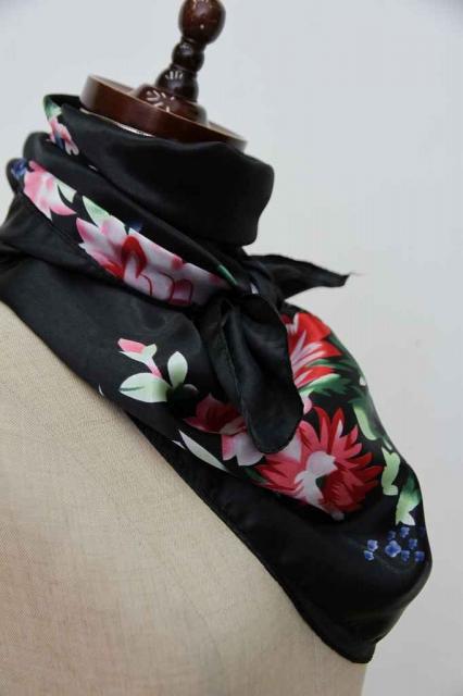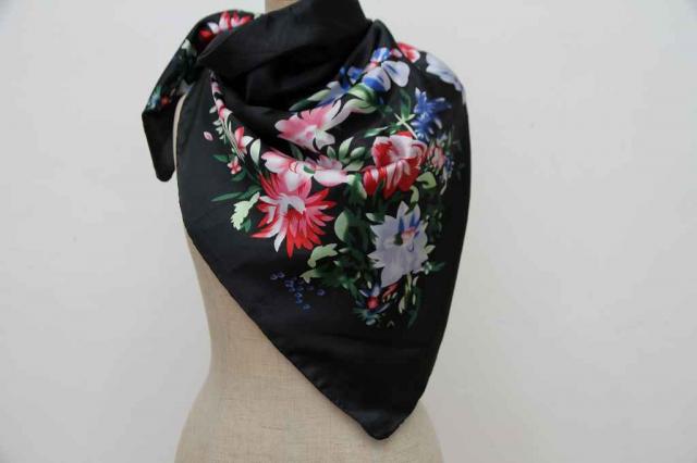 ヨーロッパから届いたヴィンテージのスカーフです。タグを見ると中国製のものです。黒地に可憐なお花がデザインされています。艶やかな雰囲気がとてもエレガント。レトロアイテムをファッションに取り入れてみませんか?