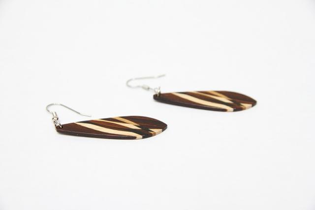 1979年創業アメリカのクラフトメーカー“davin&kesler”のピアス。木が本来持つ色や木目を生かした組木デザインは非常に細やかで、しなやかな曲線も大変美しいです。木目の落ち着いた雰囲気は、どんなテイストのファッションにも合わせやすそうです。