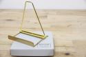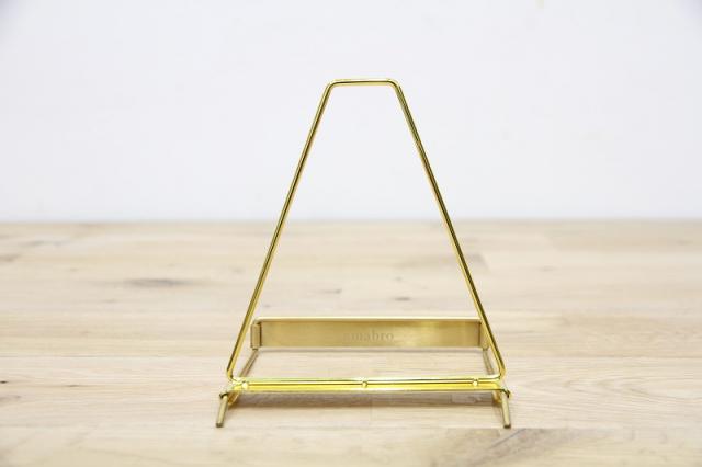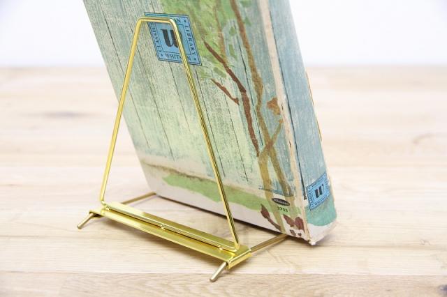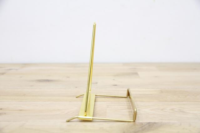 シンプルな構造のディスプレイスタンド。手前に取り付けられた真鍮のプレートが、飾るアイテムを一層引き立てます。スタンド部分をスライドさせることで角度を調節でき、タブレットやフォトフレーム、レコードなど様々なアイテムのディスプレイ什器としてお使いいただけます。
