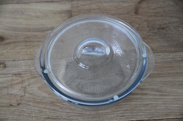 ファイヤーキングのサファイヤブルーのキャセロールです。フタ付きの中では一番小さな10オンスサイズ。お料理以外に小物入れとしてもお使いいただけます。