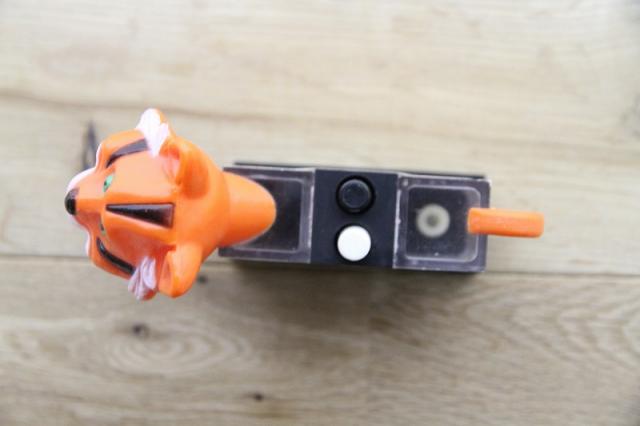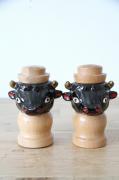 アメリカヴィンテージのプラスチック製のソルト&ペッパー。可愛らしいデザインで、背中のボタンを押すと底面から塩コショウが出る仕組みになっています。