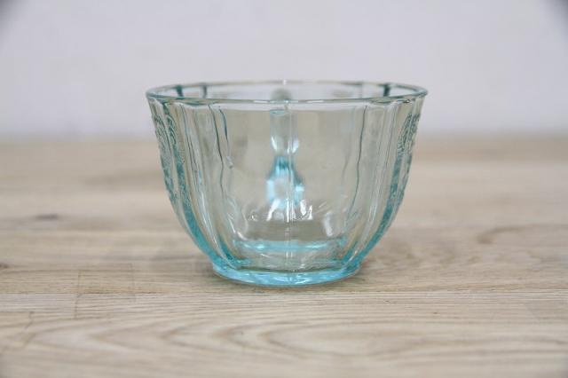 細かい刻印が施されており、高級感があるカップ&ソーサーになっております。淡い青のグラスを是非お試し下さい。