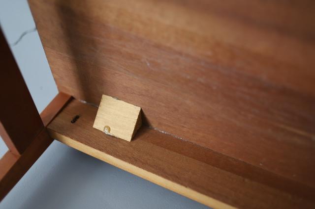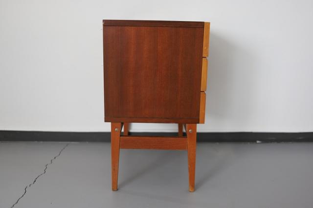 ドイツ・ベンネッケンシュタインのHARZ MOBELという家具メーカーから、ベッドサイド用の家具として当時販売されていたもののようです。外側はバーチ材やメープル材が使用されています。引き出しの取手と箱部分はプラスチック製でとってもレトロな仕上がりの3段チェスト。