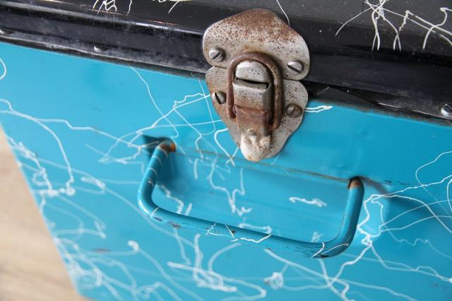 経年により、本体の金属部分には錆や塗装の剥がれ、小傷が見られます。特に金具部分には強い錆がありますが、しっかりとロック機能は保たれています。この使用感とヴィンテージ感が、長年愛用されてきた歴史を感じさせ、唯一無二の魅力となっています。