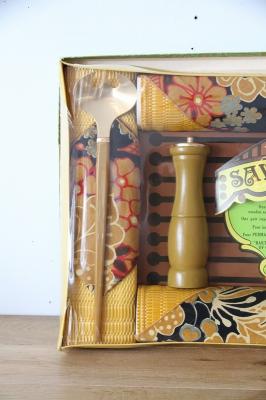 実用はもちろん、キッチンやダイニングに飾っておくだけで、ミッドセンチュリーやレトロポップな空間を演出してくれます。箱の裏面には当時の「シーザーサラダ」「ビーフ・ボルドレーズ」「チョコレートムース」のレシピが描かれており、パッケージごとコレクションしたくなる逸品です。
