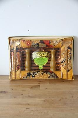 実用はもちろん、キッチンやダイニングに飾っておくだけで、ミッドセンチュリーやレトロポップな空間を演出してくれます。箱の裏面には当時の「シーザーサラダ」「ビーフ・ボルドレーズ」「チョコレートムース」のレシピが描かれており、パッケージごとコレクションしたくなる逸品です。