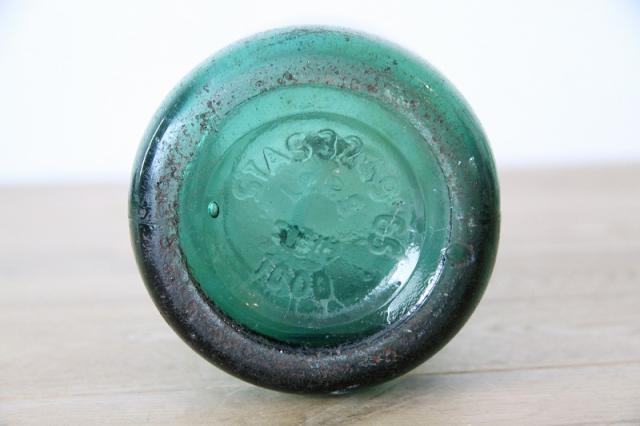 このボトルは、光を透過する美しいターコイズグリーン(またはアクアブルー)**のガラスが特徴。ぽってりとした柔らかなフォルムに、経年による味わい深い傷や気泡、そして底には製造時のエンボス加工が残されています。