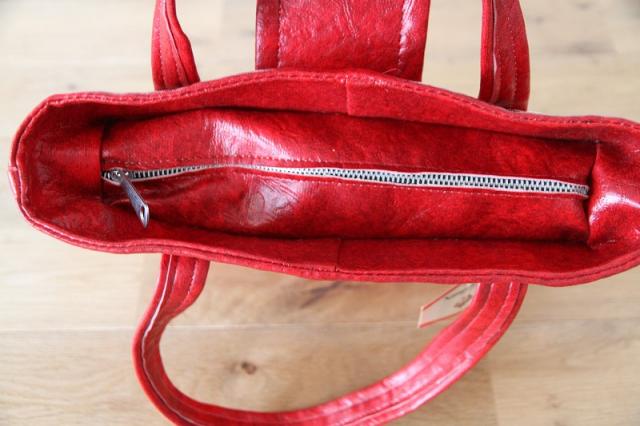 特徴的な素材「ナウガハイド」: タグにもある通り、このバッグは「Naugahyde(ナウガハイド)」というビニールレザー(合成皮革)で作られています。耐久性に優れ、手入れがしやすく、本革のような質感と光沢が特徴です。ヴィンテージアイテムとしてもコレクターに愛される素材です。