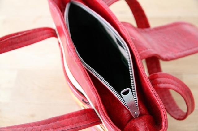 特徴的な素材「ナウガハイド」: タグにもある通り、このバッグは「Naugahyde(ナウガハイド)」というビニールレザー(合成皮革)で作られています。耐久性に優れ、手入れがしやすく、本革のような質感と光沢が特徴です。ヴィンテージアイテムとしてもコレクターに愛される素材です。