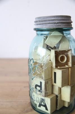 ヴィンテージ Ball社製メイソンジャーと、その中に詰められたレトロなアルファベットブロックのセットです。