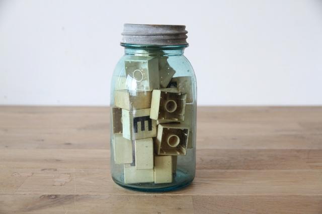 ヴィンテージ Ball社製メイソンジャーと、その中に詰められたレトロなアルファベットブロックのセットです。