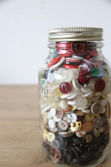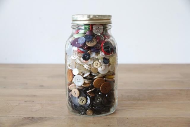 長い年月をかけて集められた、色とりどりのボタンがぎっしりと詰まったガラス瓶です。