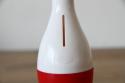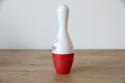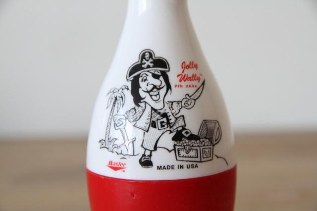 ボウリングのピンの形をしており、赤と白のプラスチック製で、海賊のキャラクター「Jolly Wally」が描かれています。