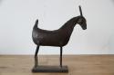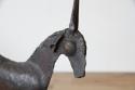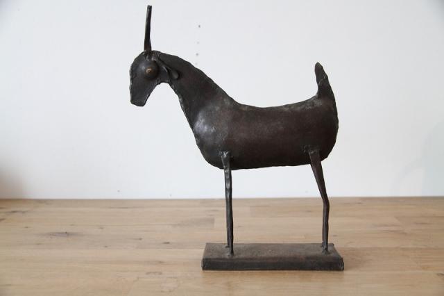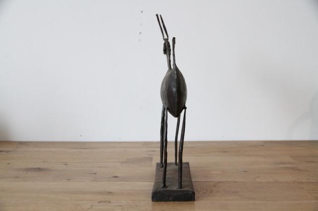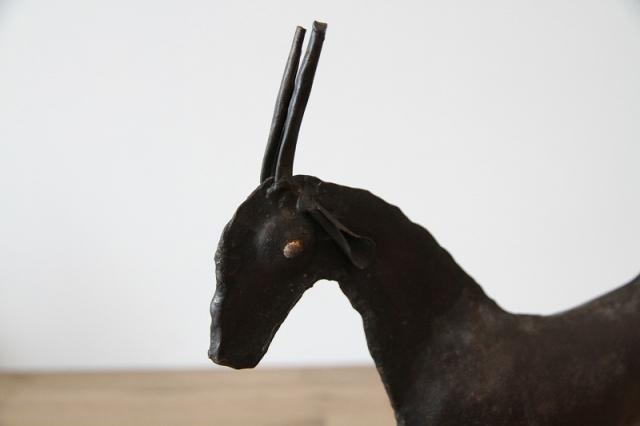 プリミティブなデザイン: どことなくユーモラスでありながら、研ぎ澄まされたようなシンプルな造形。動物(おそらく山羊やレイヨウのような草食獣)をモチーフに、鉄板と丸棒を溶接して作られています。