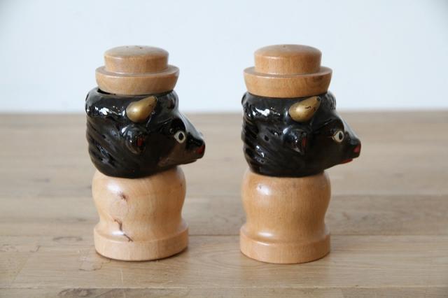 艶やかなブラックセラミックで表現された牛のヘッドと、温かみのある天然木を組み合わせた、非常に珍しいヴィンテージの調味料入れセットです。
