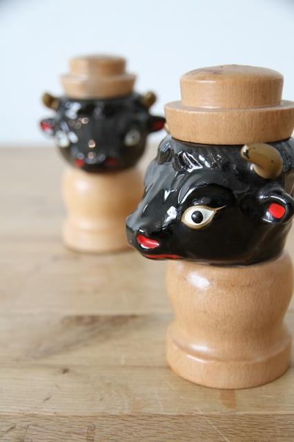 艶やかなブラックセラミックで表現された牛のヘッドと、温かみのある天然木を組み合わせた、非常に珍しいヴィンテージの調味料入れセットです。