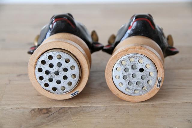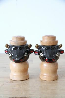 艶やかなブラックセラミックで表現された牛のヘッドと、温かみのある天然木を組み合わせた、非常に珍しいヴィンテージの調味料入れセットです。