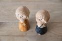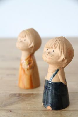 素焼きのようなマットな質感の顔立ちに、ツヤのある釉薬で仕上げられたお洋服のコントラストが美しい一品。お花を手にした少女と、オーバーオール姿の少年が、上を見上げて何かを待っているような愛くるしい表情をしています。