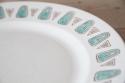 ターコイズブルー(またはアクアグリーン)の流線的なモチーフと、茶色の三角形が交互にリム(縁)を彩り、食卓にレトロで個性的なアクセントを加えます。