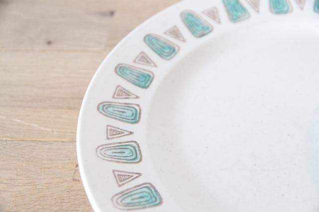 ターコイズブルー(またはアクアグリーン)の流線的なモチーフと、茶色の三角形が交互にリム(縁)を彩り、食卓にレトロで個性的なアクセントを加えます。