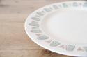 ターコイズブルー(またはアクアグリーン)の流線的なモチーフと、茶色の三角形が交互にリム(縁)を彩り、食卓にレトロで個性的なアクセントを加えます。