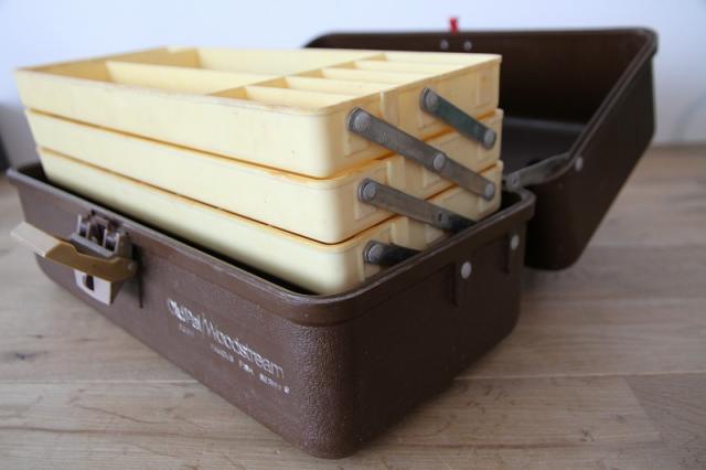 レトロなデザインと実用性: 1970年代〜1980年代頃のものと推測され、そのレトロなルックスはインテリアとしても抜群の存在感です。釣り具の収納はもちろん、趣味の道具やDIYツールの整理、小物入れとしてもおしゃれにお使いいただけます。